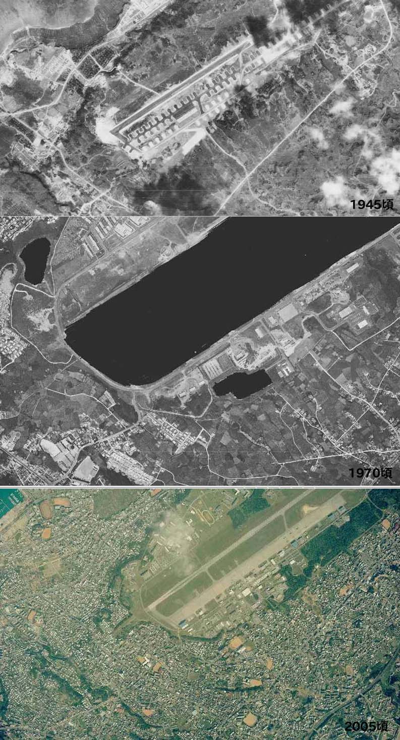 米軍基地移設問題で話題の普天間基地ですが、戦後スグと昭和45年頃と最近の3枚の写真を見比べたら状況の変化が良くわかるので紹介しておきます。